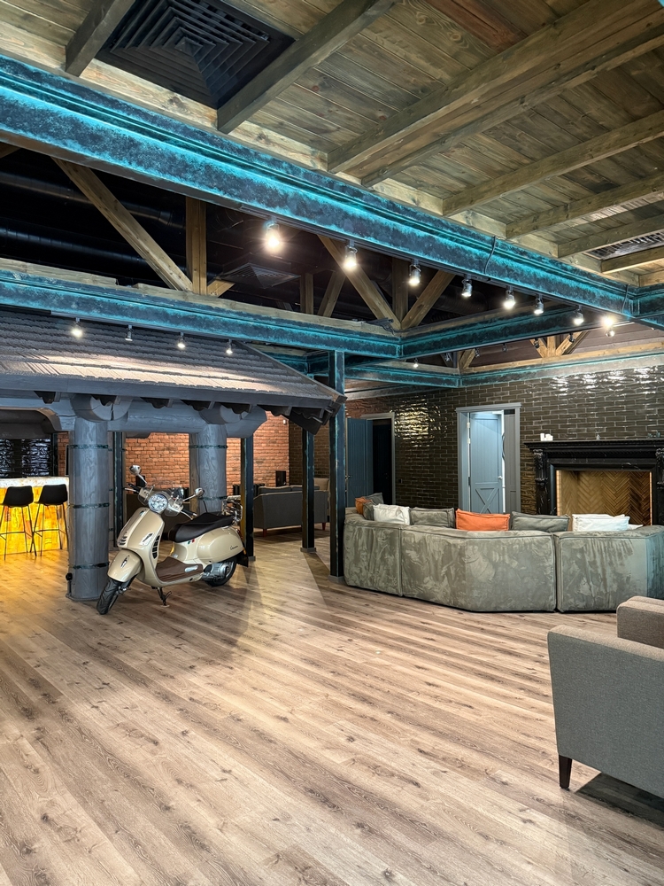 Характерно, что при проведении работ использовался кирпич и металл. Из первого сформированы внешние стены, из второго – опоры внутри. Последние прекрасно гармонируют с деревом, покрыты благородной патиной, придающей помещениям тот самый неповторимый стиль – смесь лофта с его цветовыми и фактурными законами и стилистики деревянного домостроения.