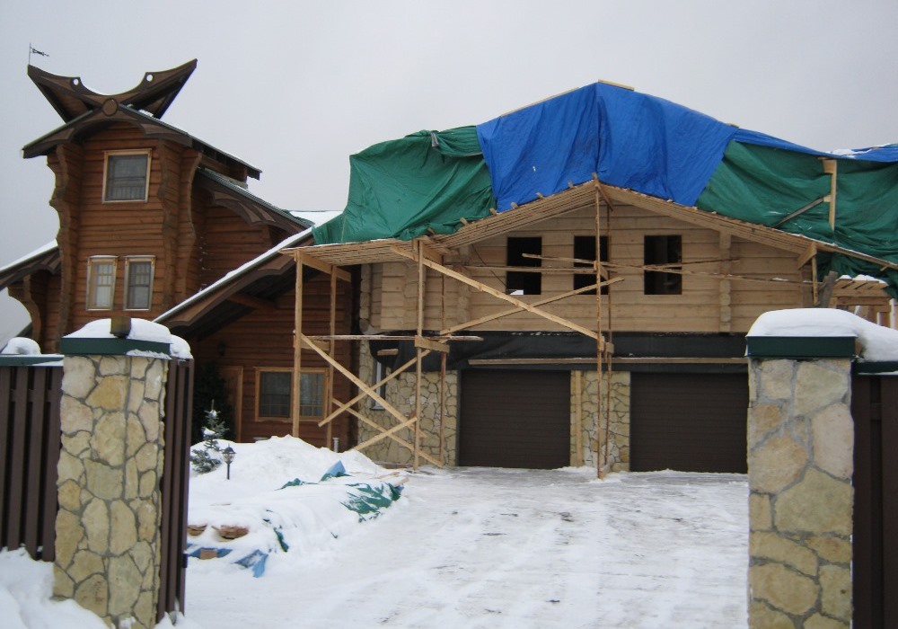 Единственное, о чем мы забыли сказать: надстройка второго этажа – вопрос не одного дня. Поэтому, чтобы в ходе реконструкции старого сруба сохранить первый этаж, важно продумать, как защитить его от атмосферных осадков. Для этого мы обычно изготавливаем каркасный навес, защищающий от осадков все «пятно» стройки.