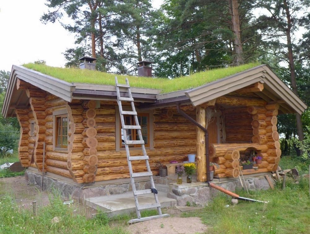 - Дерн (земляная крыша). Устройство земляной крыши – сложный, кропотливый и долгий, а потому достаточно дорогостоящий вариант. В роли кровли здесь выступает грунт, засеянный травой, что дает довольно сильную нагрузку на опорные элементы. Но оно того стоит: дом приобретает сказочные черты, выглядит ярко, необычно и весьма колоритно. Расценки на изготовление кровли из земли начинаются у нас от 700 рублей за «квадрат».
