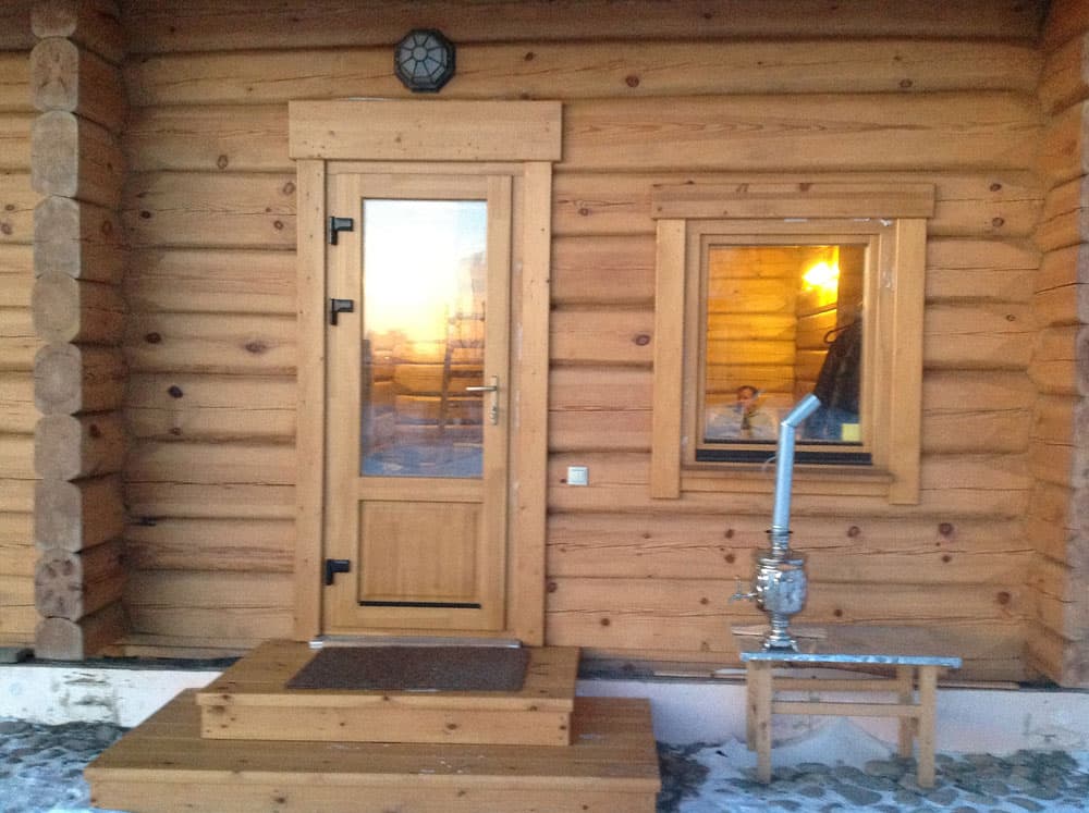Работой, завершающей первый этап строительства бани из бревна под ключ, является монтаж окон и входной двери. В состоянии, когда у вашей бани есть утепленный периметр, она может находиться достаточно долго, но это вовсе не означает, что сруб нужно непременно «отстаивать» и ждать его усадки. Сруб даст бóльшую часть усадки в первый отопительный сезон, поэтому, если все же есть необходимость взять паузу в строительстве, лучше это делать зимой, поддерживая внутри плюсовую температуру.