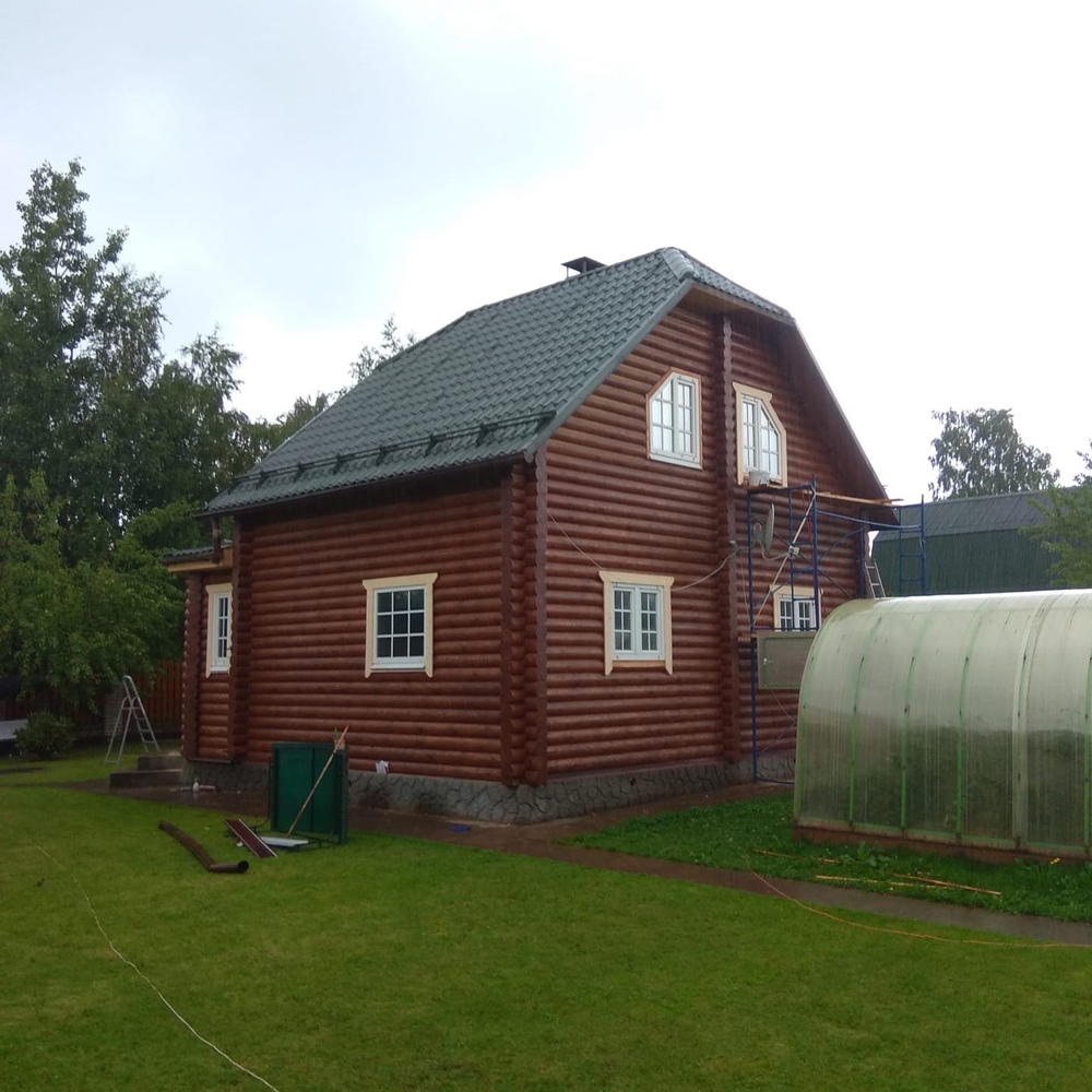 - Покраска. Окрашивание осуществлялось с использованием составов, устойчивых к ультрафиолету, перепадам температур и прочим внешним факторам. Цвет подбирался с помощью выкрасов. Такая методика предполагает нанесение на подготовленный участок поверхности бревна нескольких оттенков состава, из которых после высыхания заказчик выбирает наиболее понравившийся ему вариант.