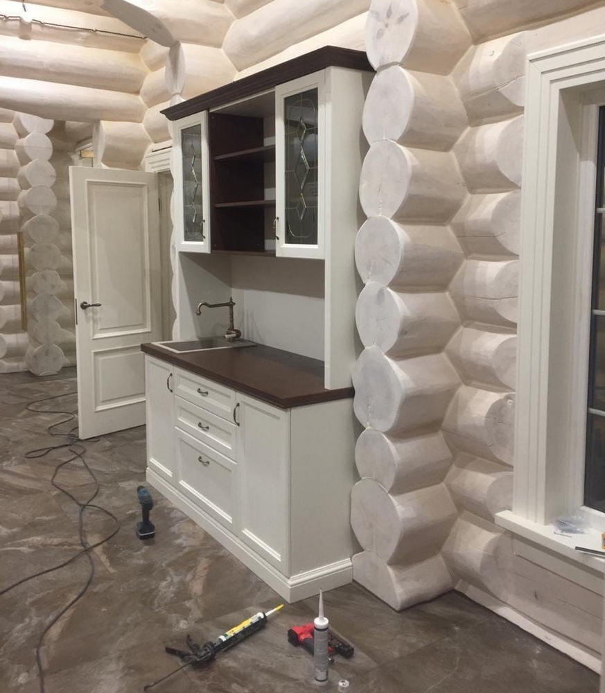 - Защитите стены в мокрых зонах. Внутренняя отделка срубового дома естественно затрагивает мокрые зоны. Избежать порчи бревенчатых стен водой помогут специально подобранные краски и герметики или специальные каркасные конструкции, защищающие бревна от попадания на них влаги. Особое внимание во время внутренней отделки бани из сруба необходимо уделить обустройству рабочего пространства на кухне и санузлов.