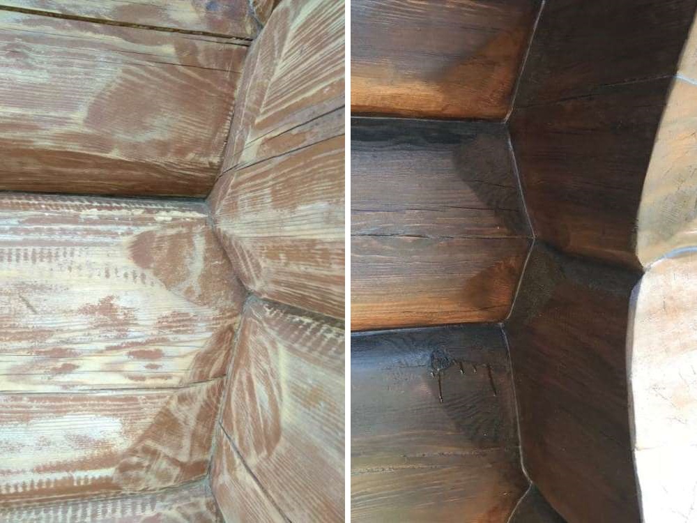 Как исправить ошибки в окраске сруба? Сначала требуется шлифовка, затем снятие старого состава и перекраска. Это требует больших трудозатрат, и в случае с внутренними работами из дома приходится выезжать. Так что лучше всего таких ошибок не совершать, а своевременно обратиться к специалистам для выполнения окраски сруба или хотя бы консультации.