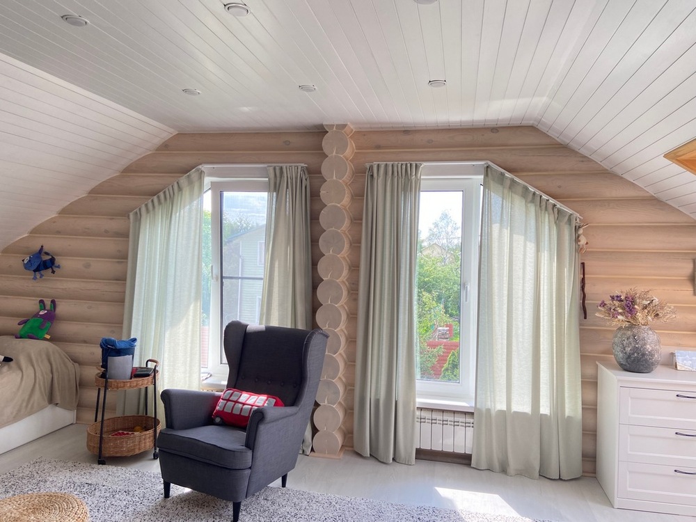 Окраска бревна внутри дома лессирующими составами формирует более тонкий слой. Он не скрывает текстуру древесины, а лишь немного тонирует ее и подчеркивает. Это позволяет сохранить естественный рисунок и придает помещению неповторимый натуральный стиль.