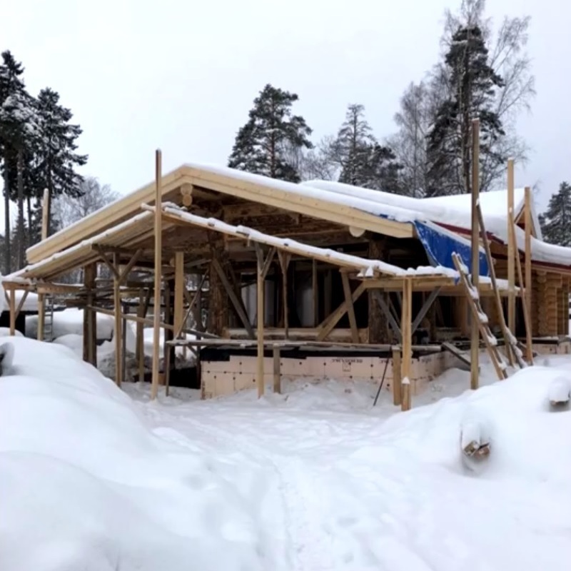 Особенность ситуации заключается в том, что сруб уже построен. Это усложняет возведение дополнительной конструкции, вплотную примыкающей к постройке. Однако тут мы в очередной раз доказали, что для наших специалистов нет ничего невозможного.