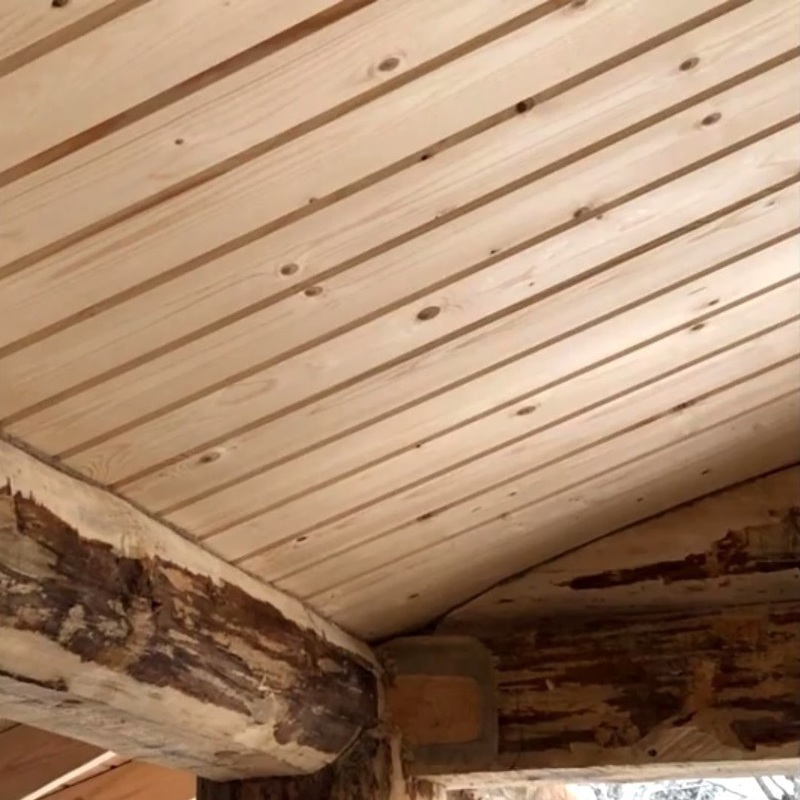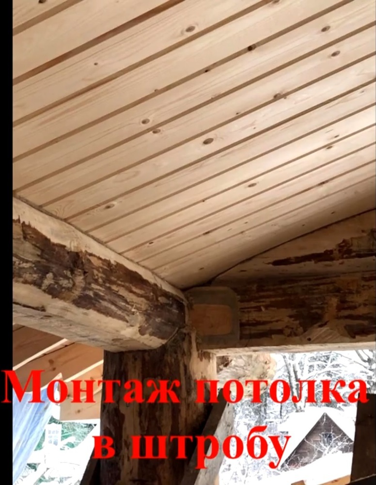 - Соединение со зданием. Чтобы обеспечить плотное прилегание подшивки к внешней стене, были подготовлены штробы. В них заводились деревянные рейки, формирующие внутренний потолок, что создало эффект цельной конструкции.