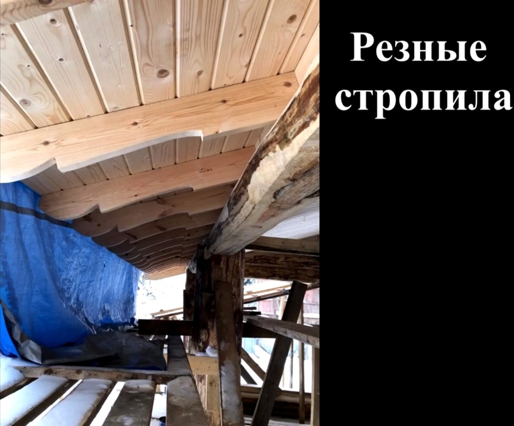 - Резные стропила. Навес эксплуатируется на улице. Это не предполагает его утепления и сокрытия стропил. Дабы улучшить внешний вид сооружения, было решено использовать резные элементы. В результате стоимость изготовления кровли несколько возросла, однако результат полностью оправдал дополнительные расходы.