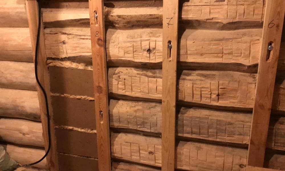 - В-третьих, все пазы бревна, которые будут закрыты будущим каркасом, должны быть загерметизированы! Этим почти никто не занимается, а зря. Когда сруб дает усадку, неизбежно появляются щели в чашках. Если это внутри комнаты, не составляет никаких проблем проконопатить и исправить этот момент. Но если при внутренней отделке сруба за каркасом начинается промерзание, это грозит серьезными последствиями в виде замерзших или даже лопнувших труб отопления или канализации, которые зачастую прикрываются каркасами.