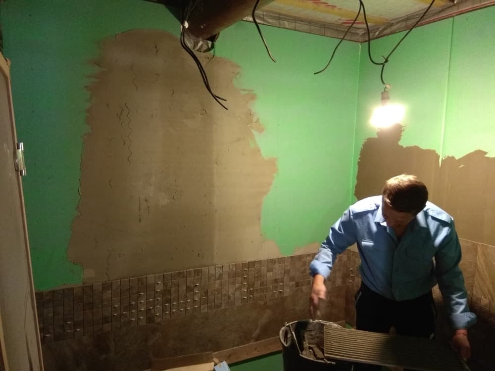 - После того, как гидроизоляция высохнет, можно продолжить работы по внутренней отделке сруба и укладывать плитку.
