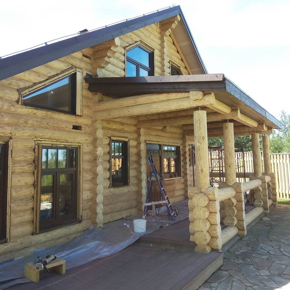 В течение недели после шлифовки массив обрабатывают пропитками. В противном случае древесина может изменить цвет, и на ней могут появиться визуальные дефекты. Составы наносятся валиком или кистью (в зависимости от самого состава и рекомендаций производителя), обязательно равномерно распределяются по поверхности. Пропитки мы подбираем индивидуально, как правило, они зависят от специфики эксплуатации постройки, климата, особенностей конкретной древесины и других факторов.
