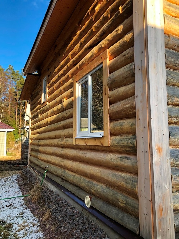 Когда компания «УтКи» выполняет такие работы, мы всегда рекомендуем выкрашивать фасады тонированными составами. В таком случае, даже если фасад загрязняется, это совершенно не бросается в глаза. И если мы будем покрывать сруб маслом, например, маслом Saicos, то для удаления пыли и грязи мы используем мойку высокого давления. Помыли фасад раз в два года – и домик чистый.