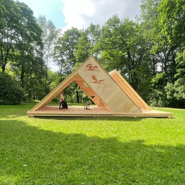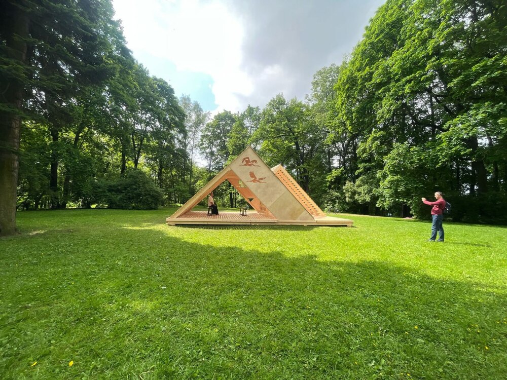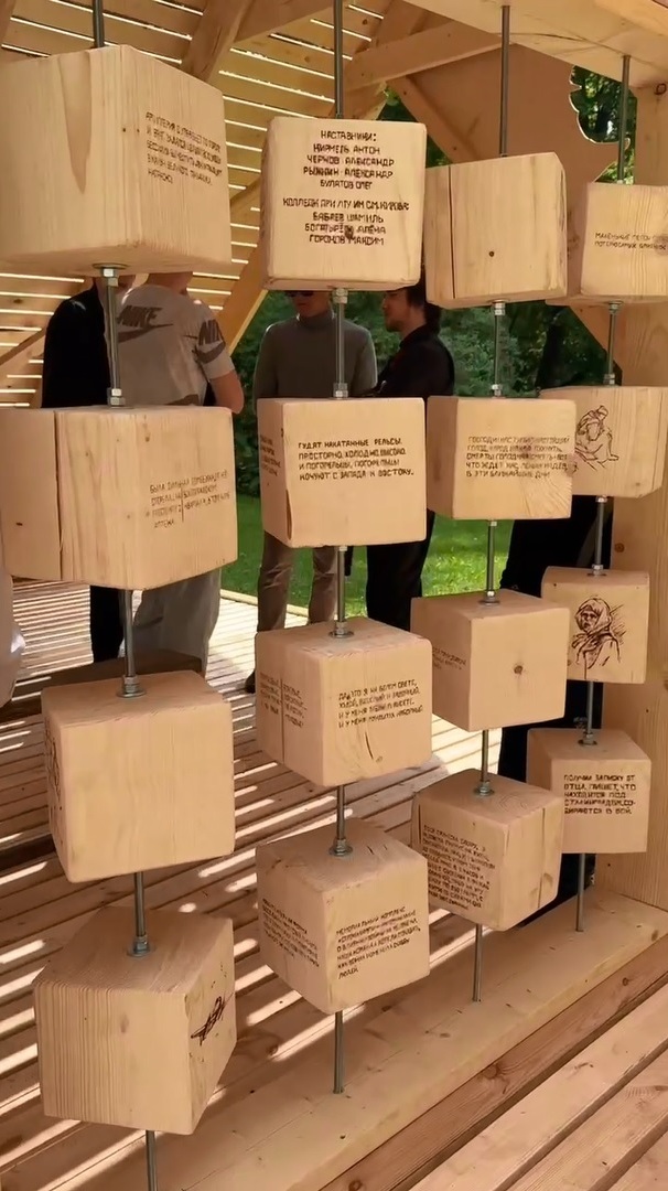 Тема практикума в этом году была приурочена к 80-й годовщине Победы в Великой отечественной войне и звучала так: «Дерево памяти: пространства осмысления». Проект команды Антон под названием «Строки памяти» – это треугольная беседка, символизирующая письма-треугольники военного времени, с изображениями журавлей и другими элементами, которые напоминают о всех тяготах 1940-х годов.