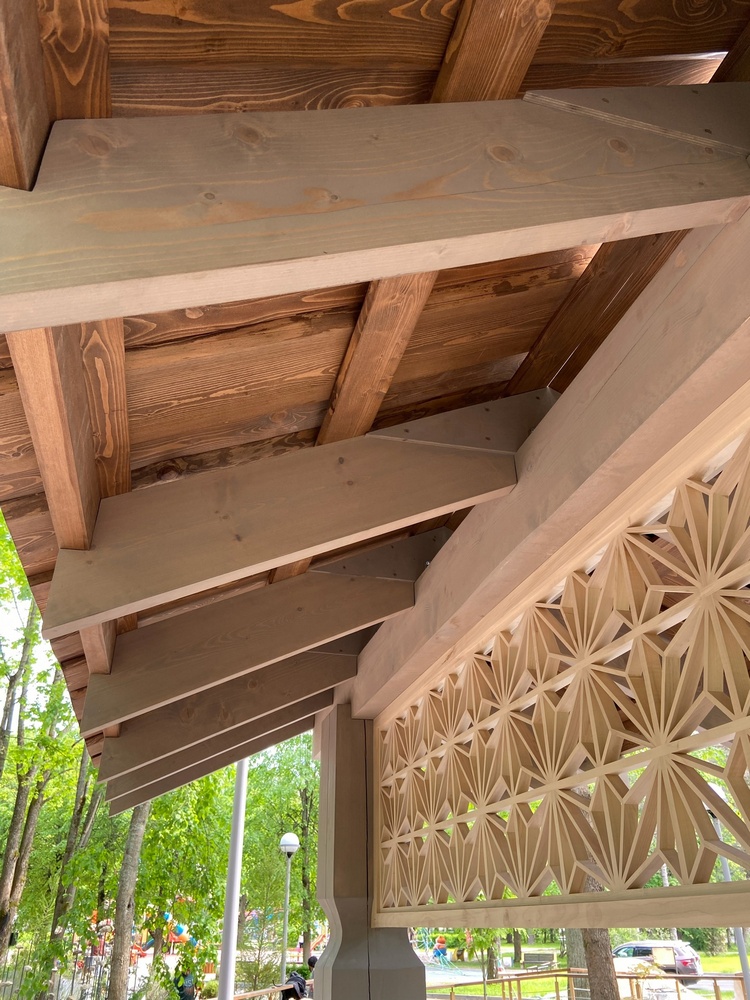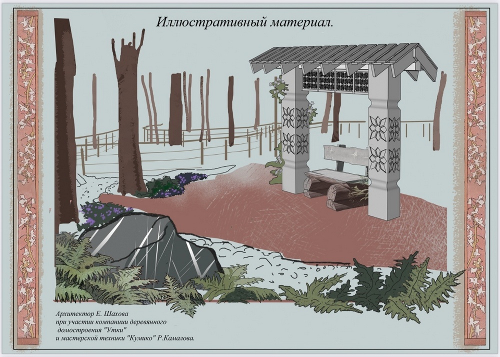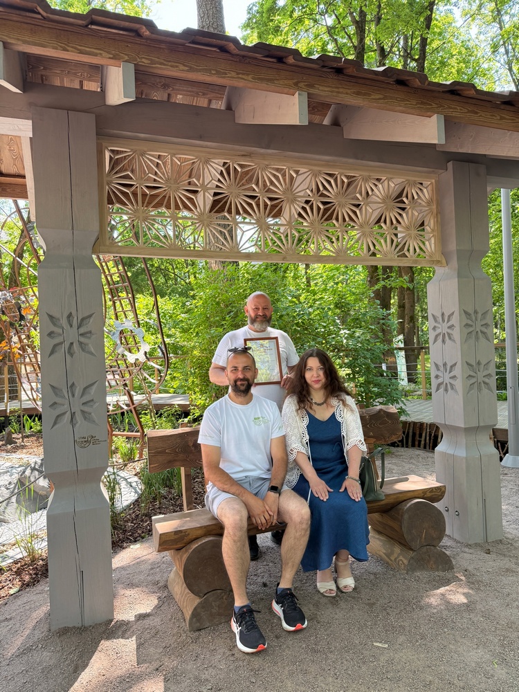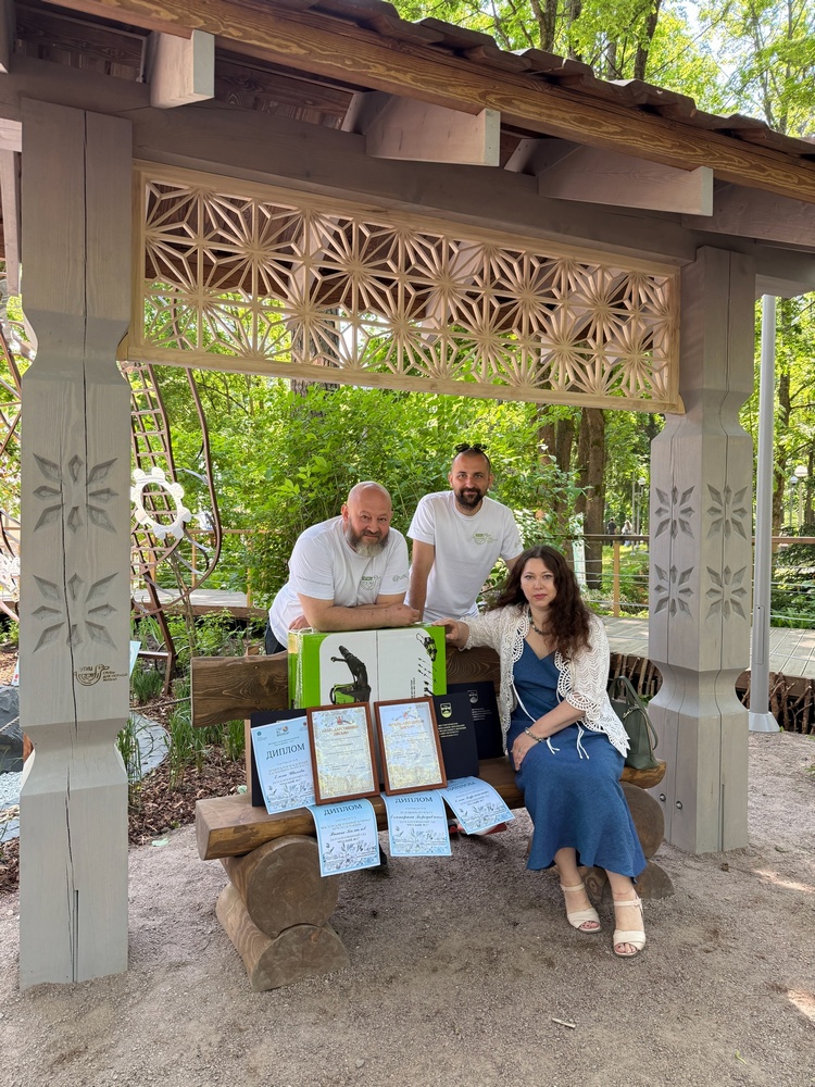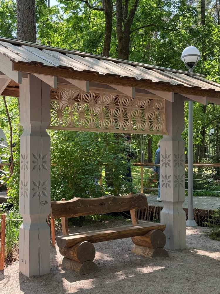 Малые архитектурные формы в нашем исполнении вызвали интерес у посетителей: все хотели с ними сфотографироваться и потрогать – ведь натуральное дерево так приятно на ощупь! Декоративное резное панно для навеса в японской технике кумико создал мастер Ринат Камалов, а для покрытия древесины использовали натуральные краски и масла Saicos.