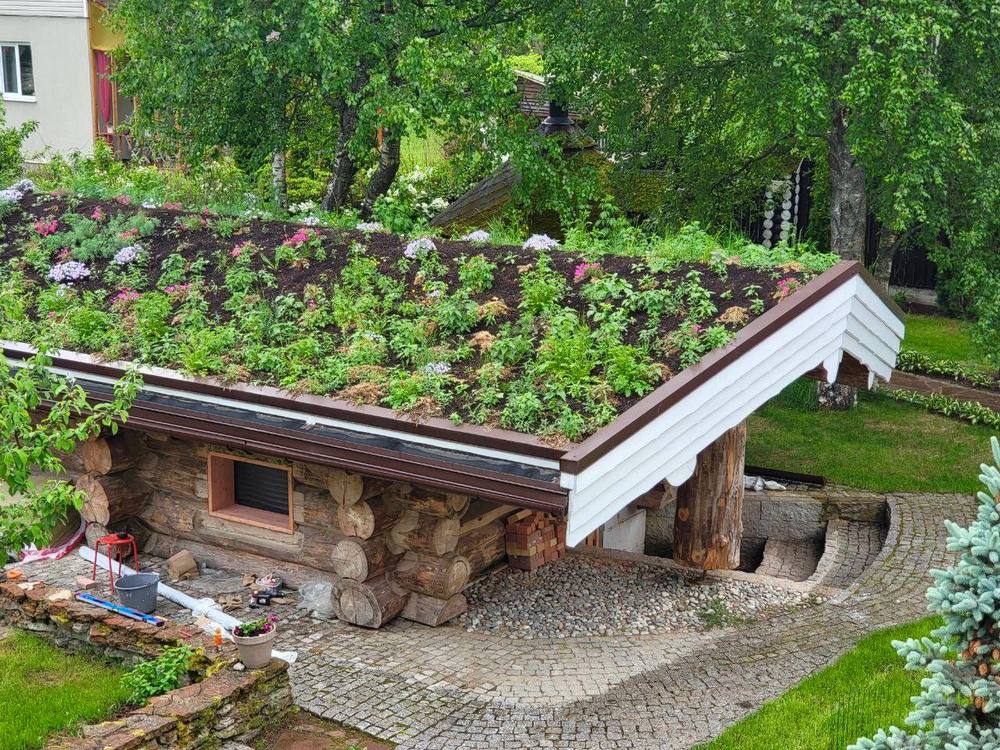 В каждой шутке только доля шутки, и полноценные клумбы на земляных кровлях – вполне рабочий вариант. Об этом наглядно говорят работы нашего друга Елены Шаховой – ландшафтного архитектора и дизайнера. На фото – баня из окоренного бревна, которая заметно преобразилась с прекрасной клумбой на своей кровле.