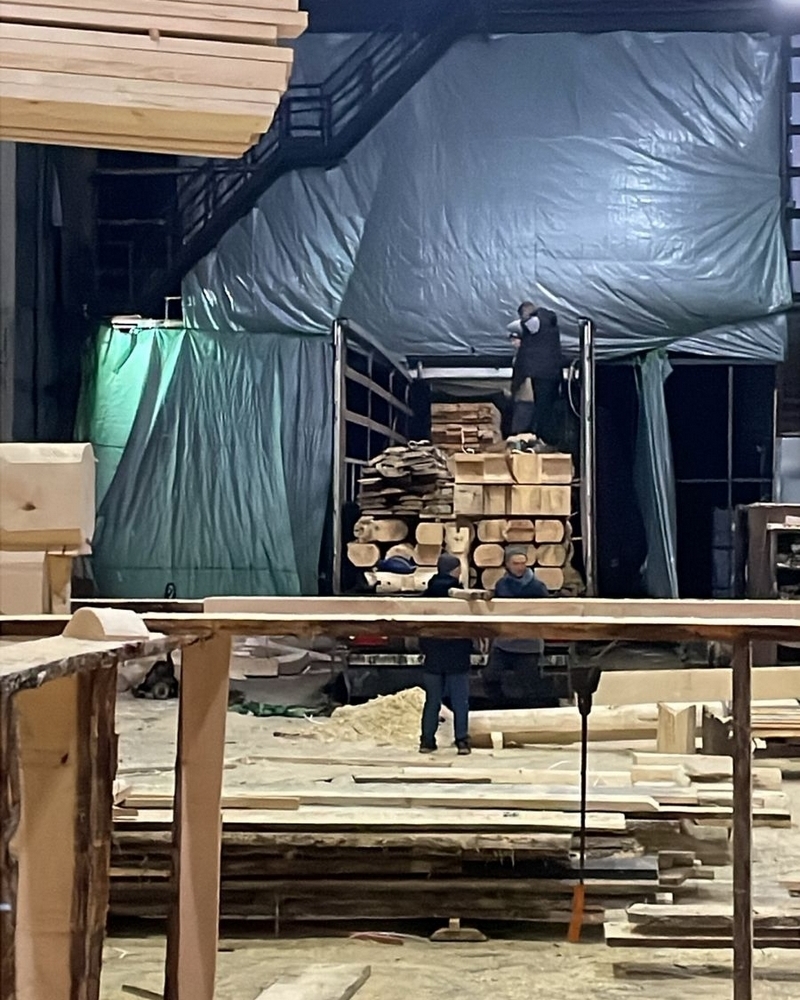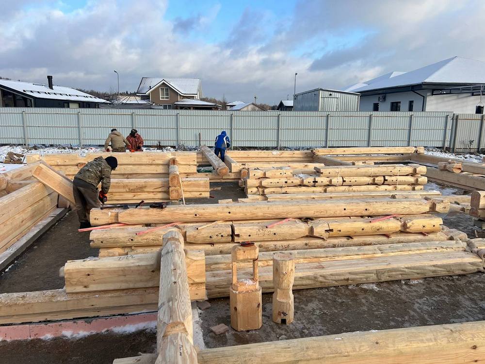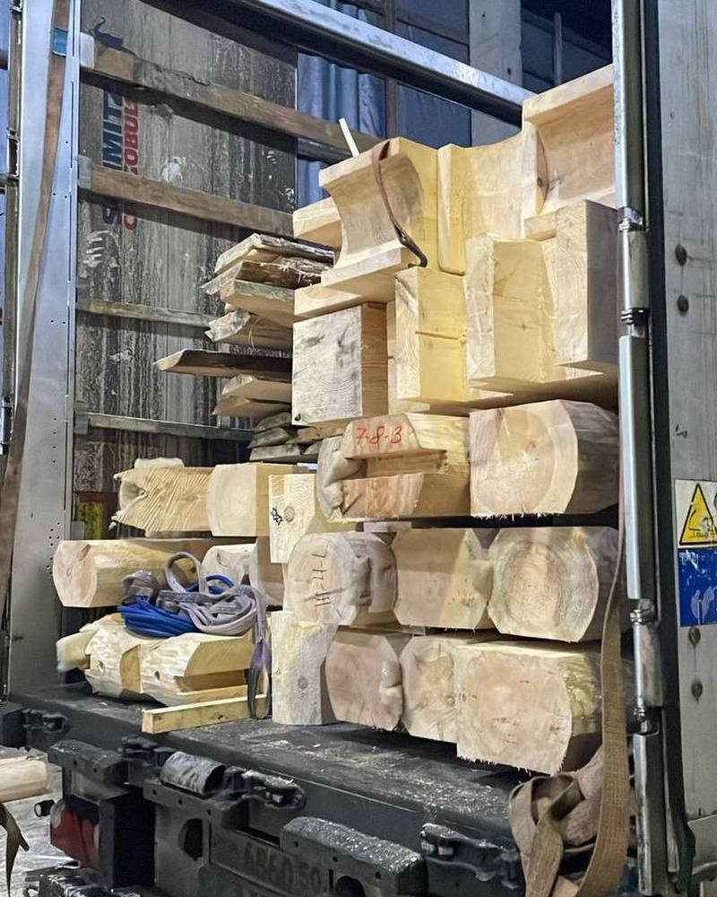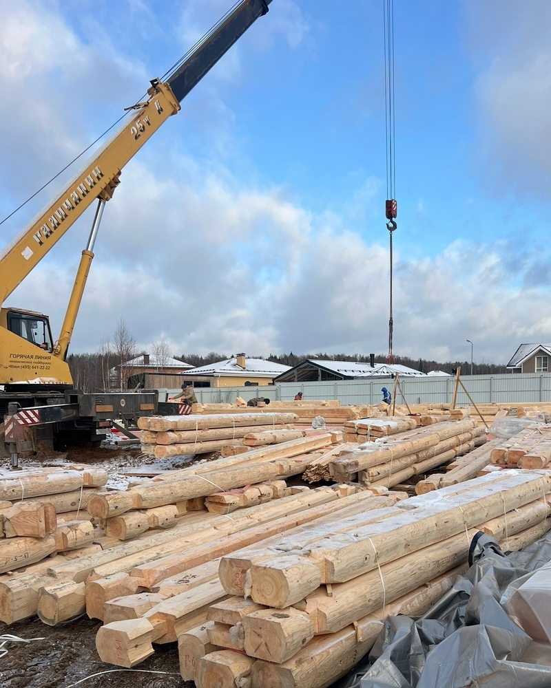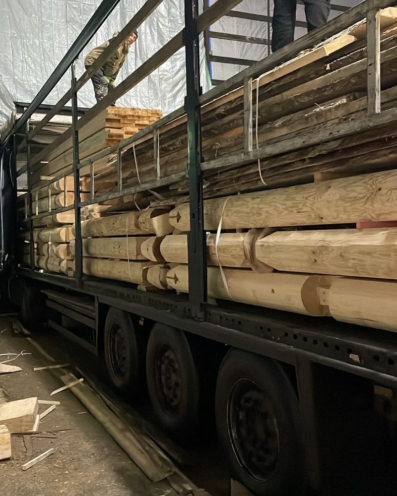 Сруб из лафета на фотографиях ниже мы грузили день и увезли в Подмосковье. В 23:00 выехала последняя фура, а за ней и мы. Все, кроме водителей, спали в машине. В 6 утра мы были в Подмосковье, которое нас встретило прекрасным зимним дожем со снегом. А еще последняя фура опоздала на сутки, кран при въезда на участок сломал рессору…