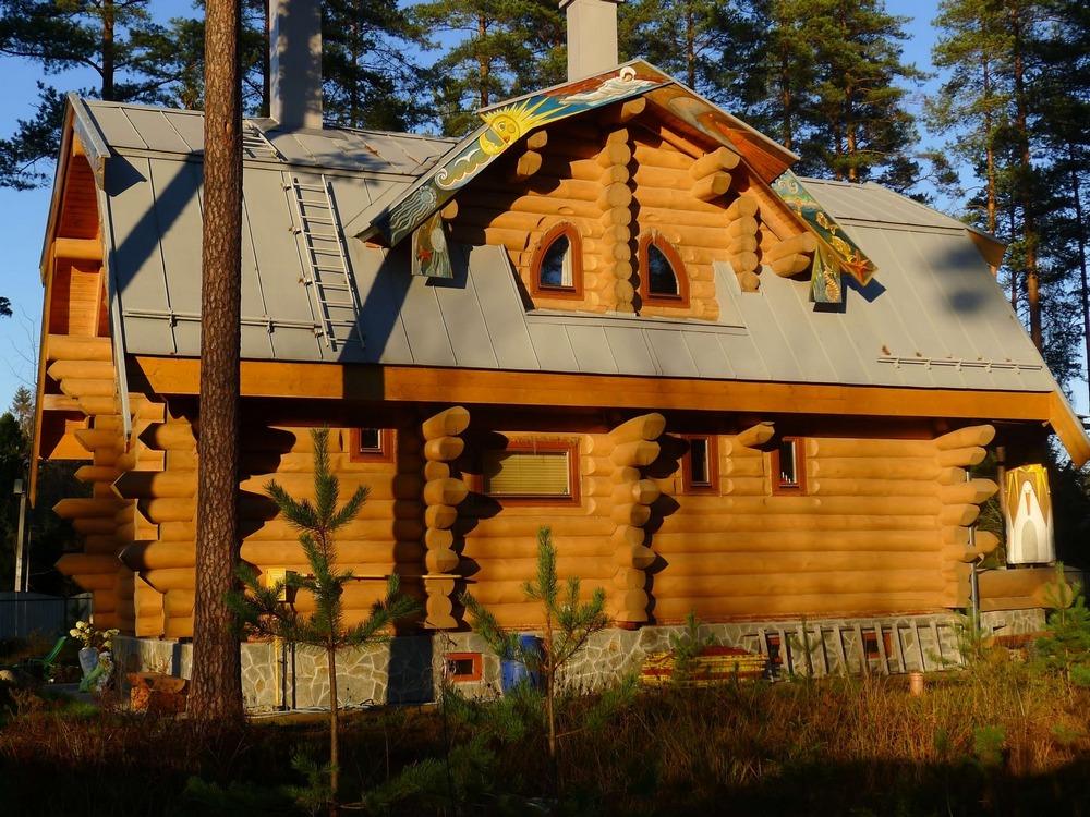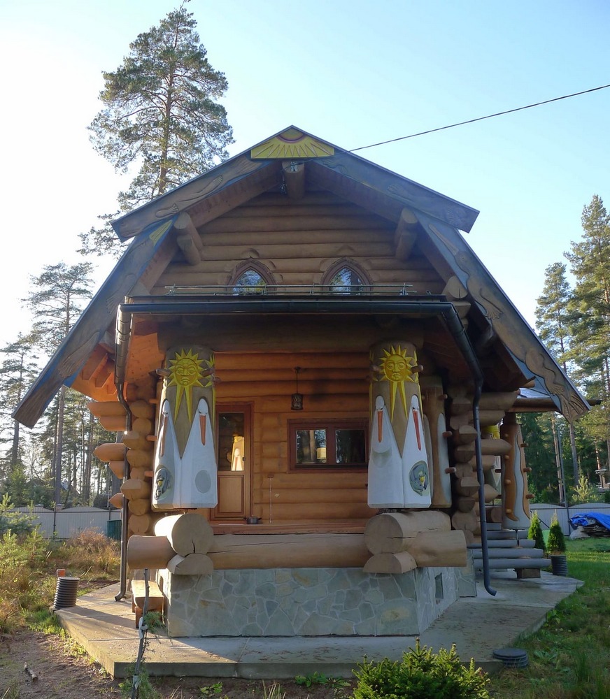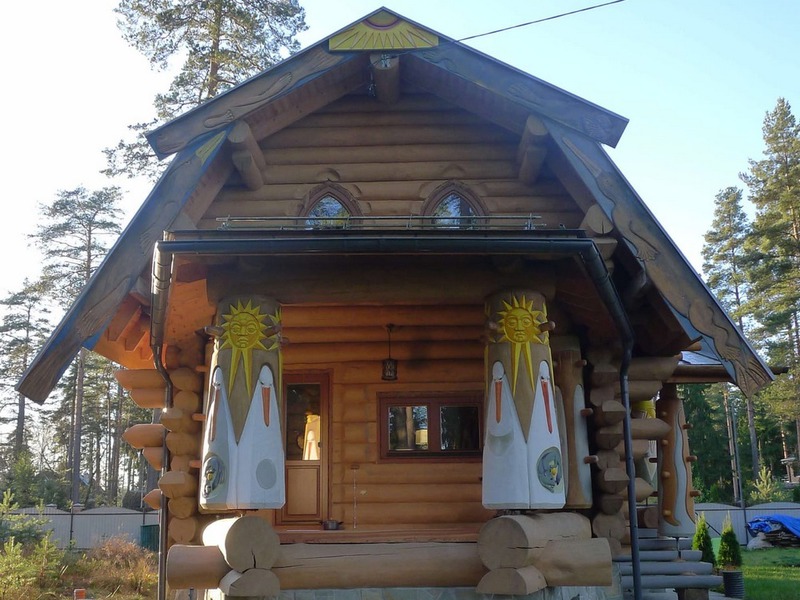 Когда мы прощались с ним, собранным на участке заказчицы, он уже был красив – с резными ангелами, птицами и старославянскими надписями. А теперь резные узоры приобрели цвет, и терем еще больше преобразился. Смотрите сами!