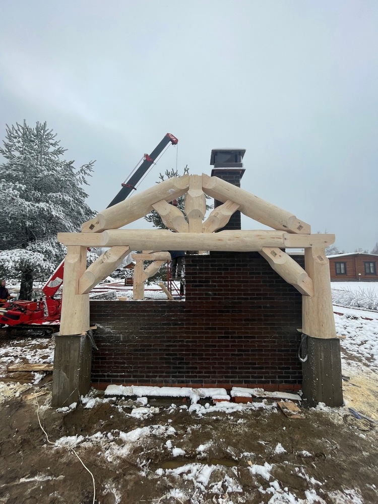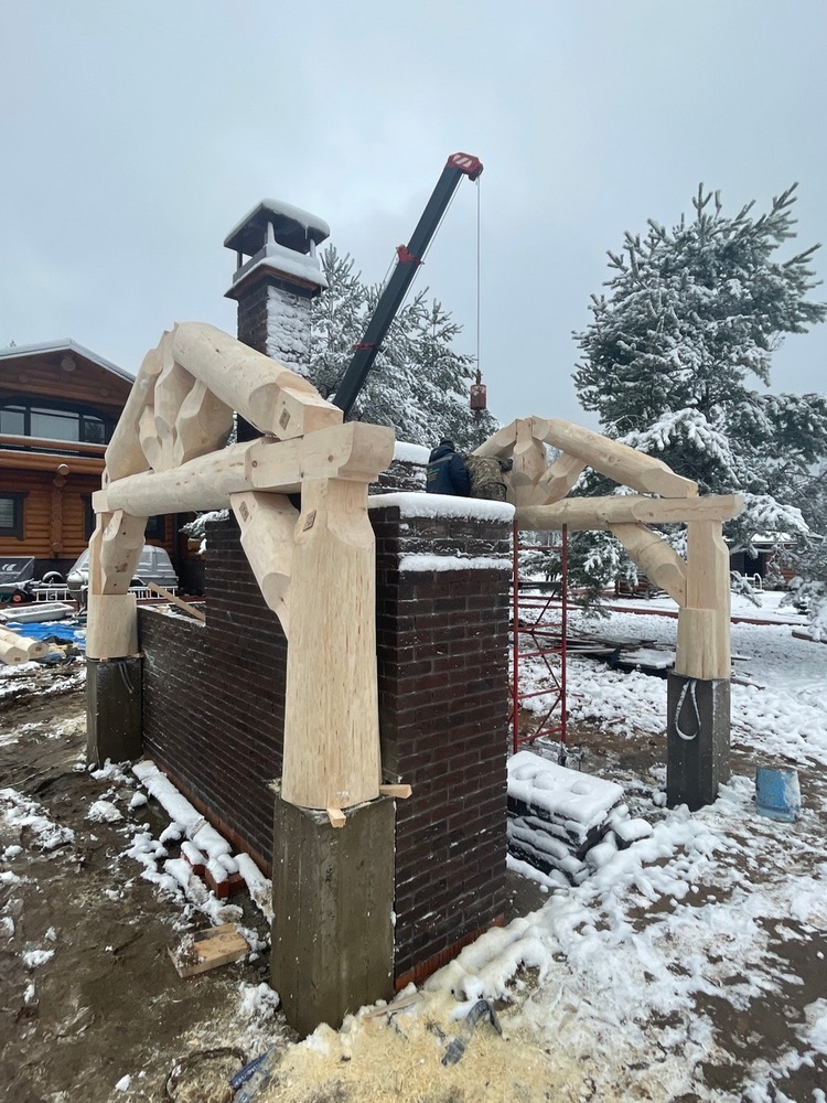 Примечательно, что строительство каркасно-бревенчатого дома post & beam выполнялось с использованием фигурных элементов. Их подготовка усложнила задачу, но позволила получить уникальную постройку, идеально дополняющую участок.