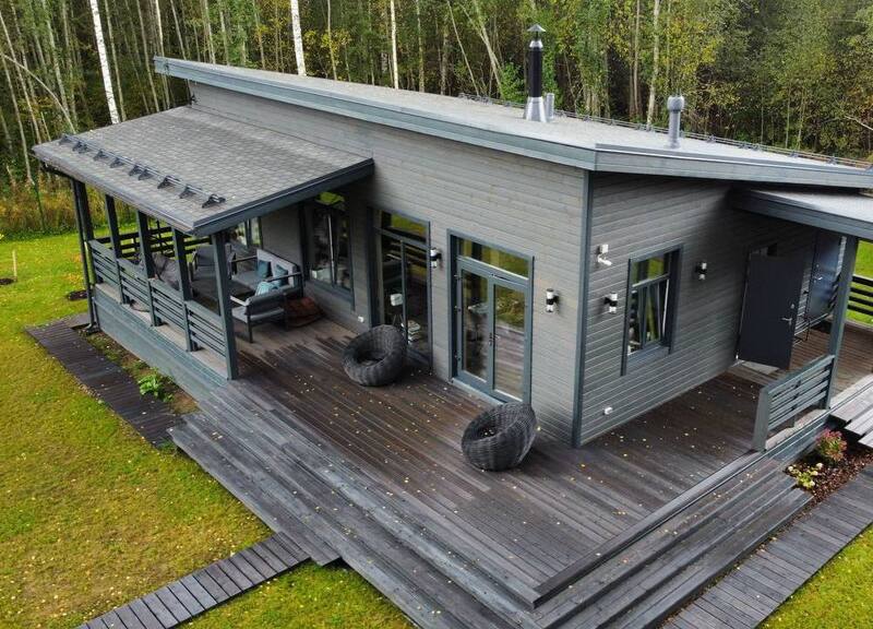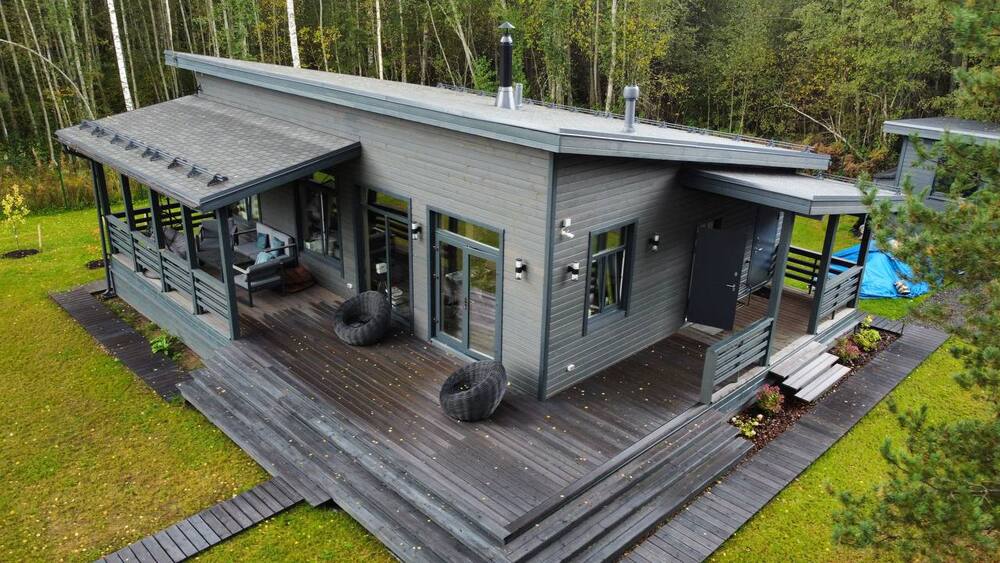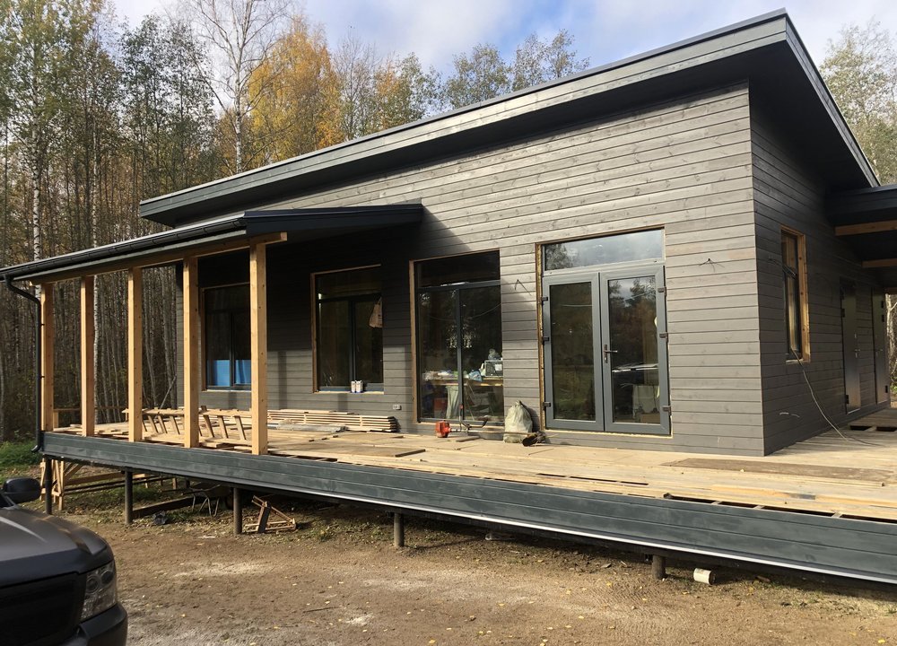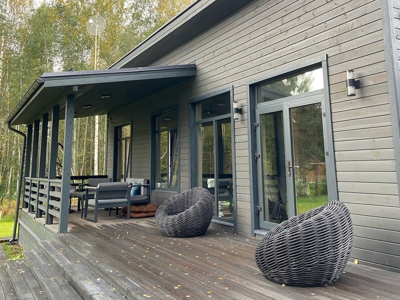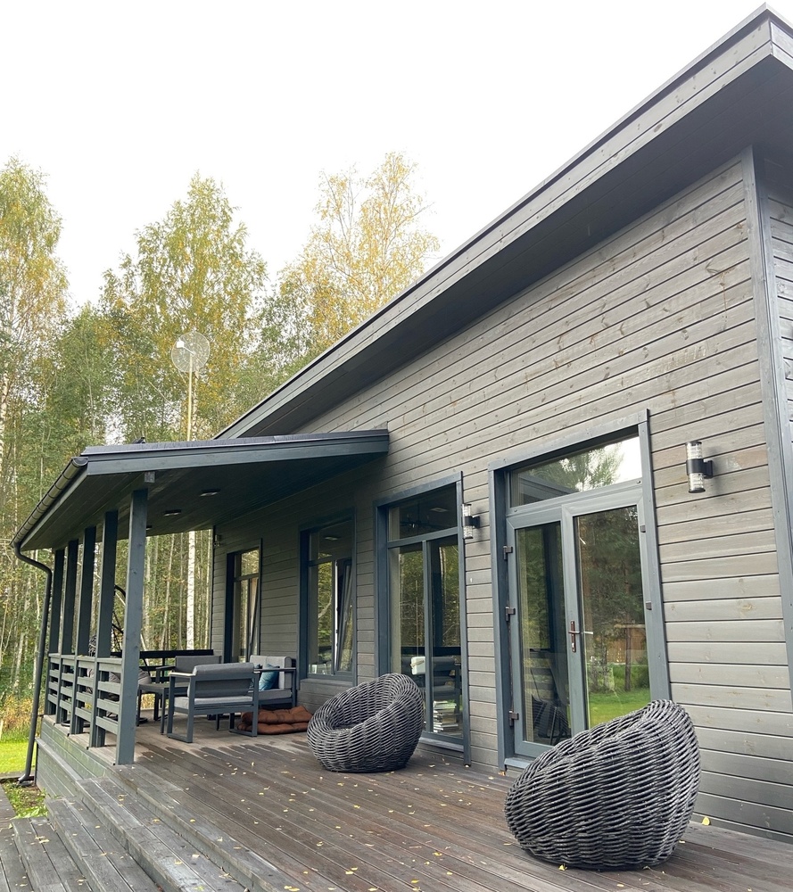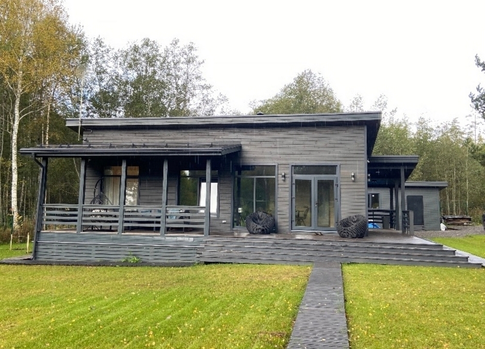 Изготовление каркасных домов – одно из наших приоритетных направлений. Мы с удовольствием принимаем подобные заявки и реализуем их. Очередное строительство каркасника выполнено в рамках данного кейса. Площадь дома составила около 100 кв.м, террасы – около 40 кв.м. Здание имеет один этаж, односкатную крышу и навес на террасе. В нем предусмотрена большая кухня-гостиная с панорамными окнами, три спальни, два санузла, сауна, тамбур и котельная. Возведение начато в июле 2022 г., а закончено уже в сентябре.