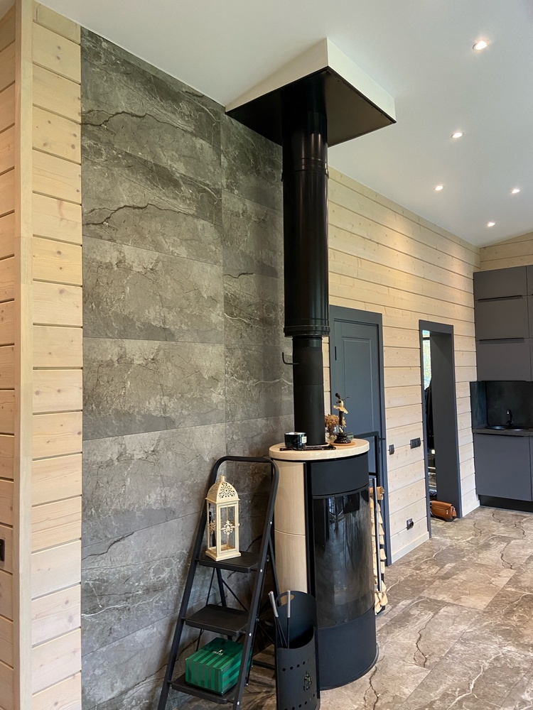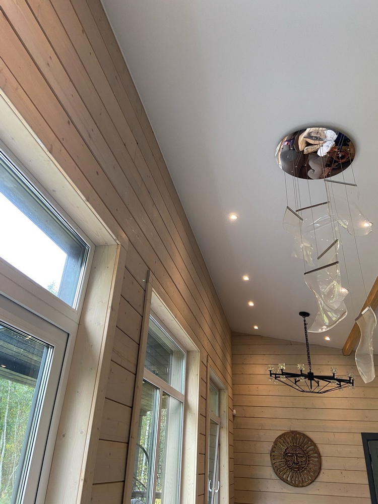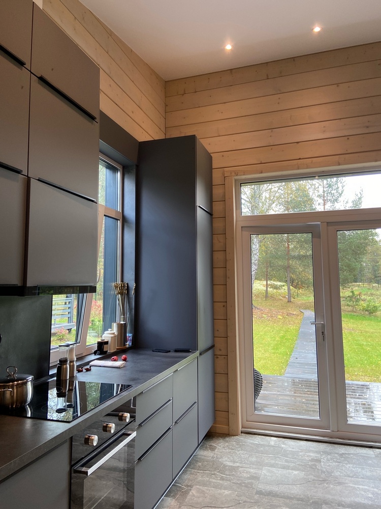 Отделка каркасника внутри выполнена лишь отчасти. Мы изготовили потолки и полы без финишного покрытия, все остальное собственник сделал сам. Такой подход позволяет сэкономить бюджет при наличии подходящих навыков и оснастки.
