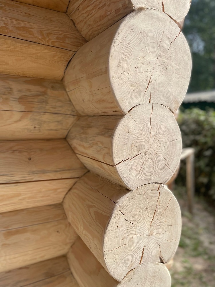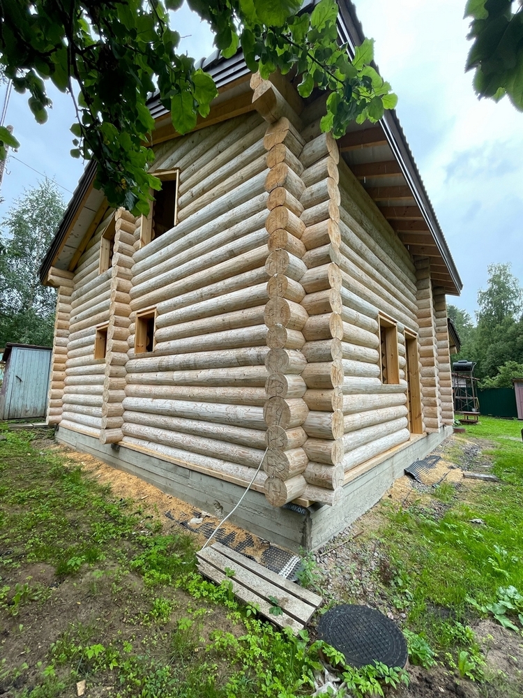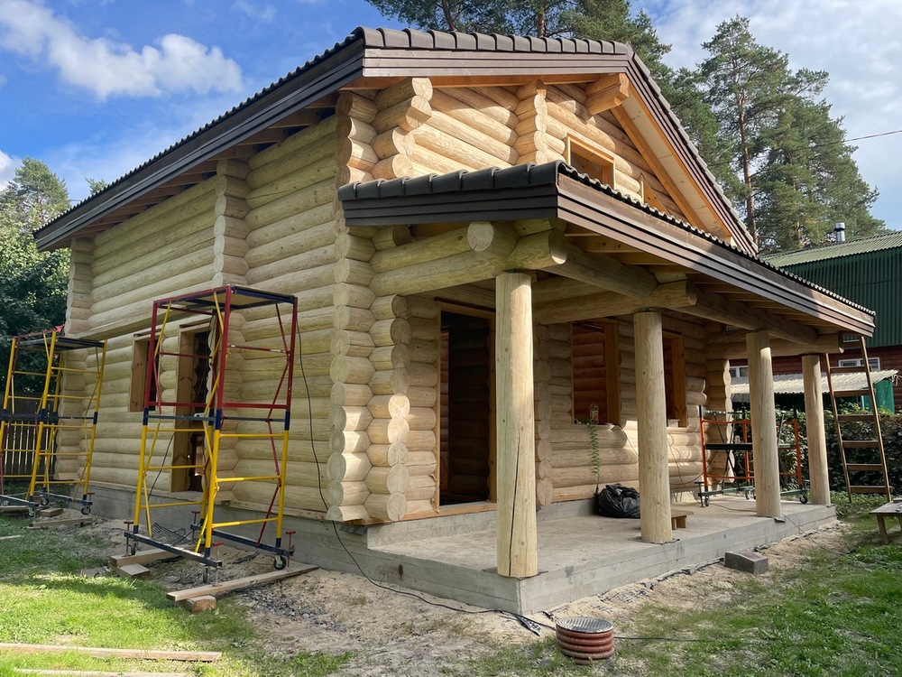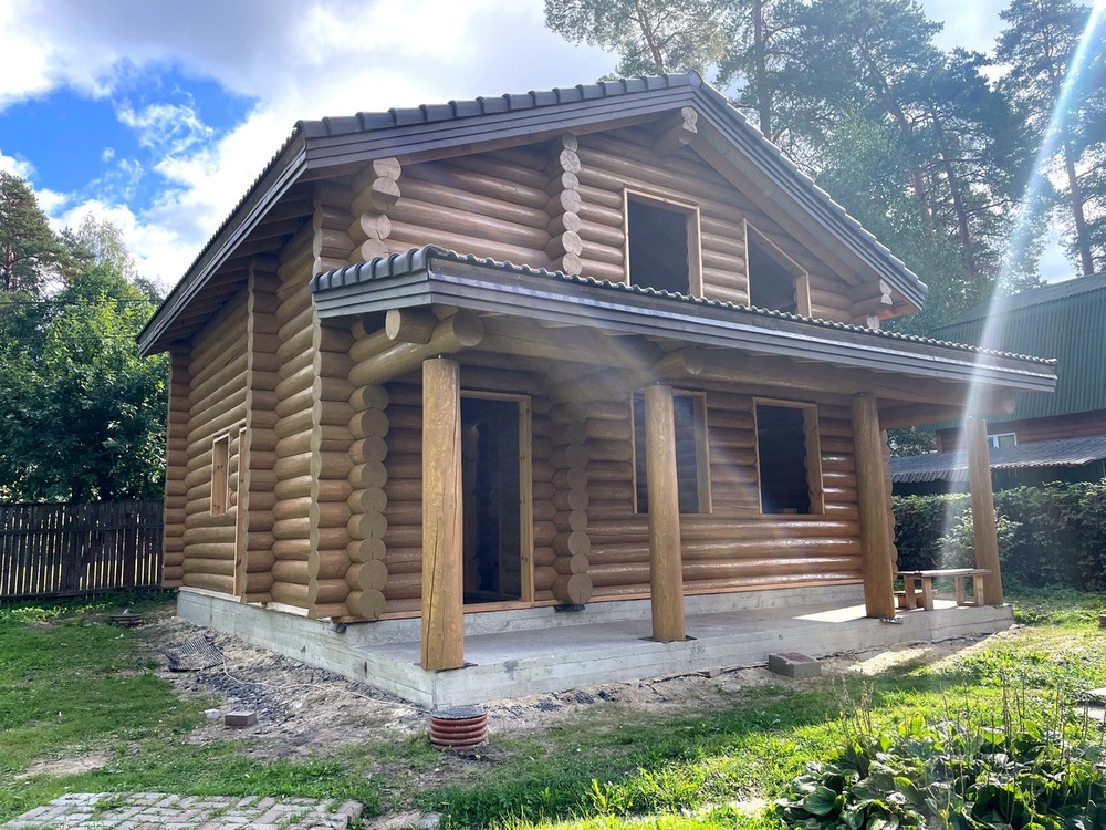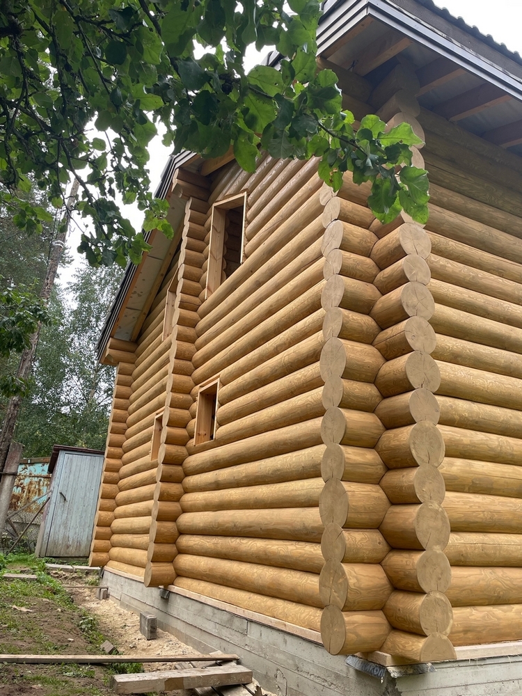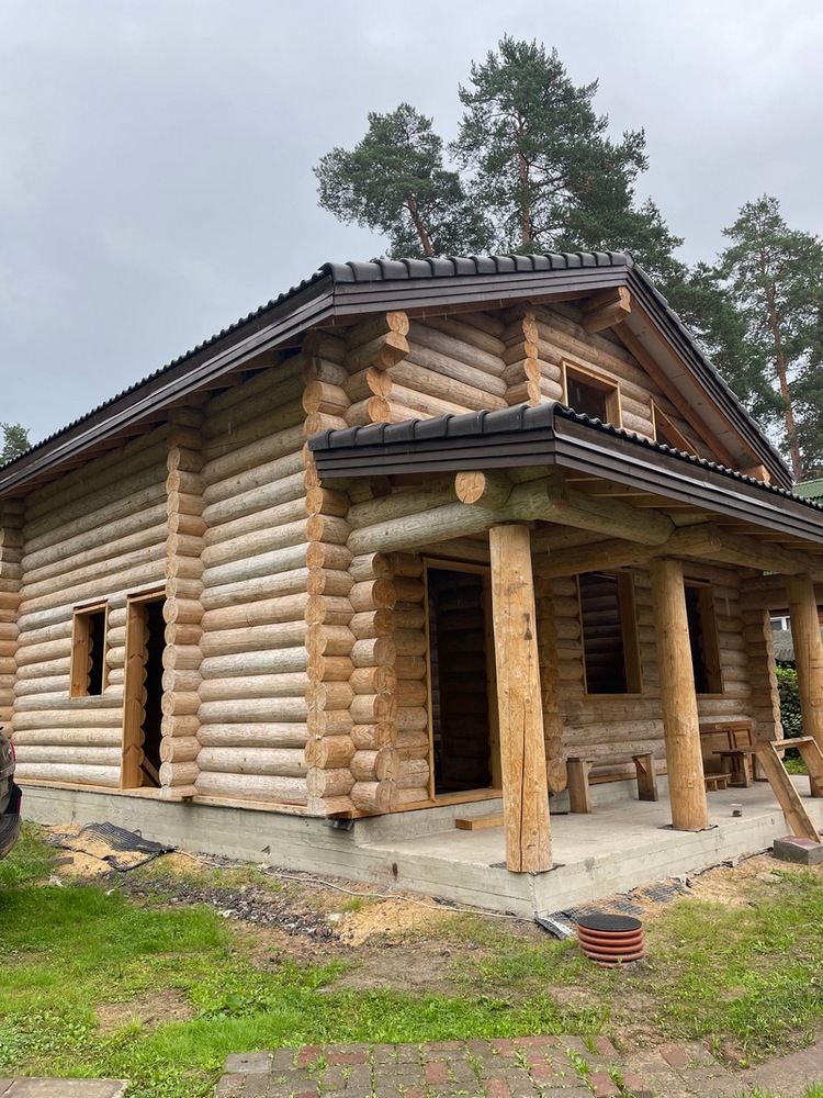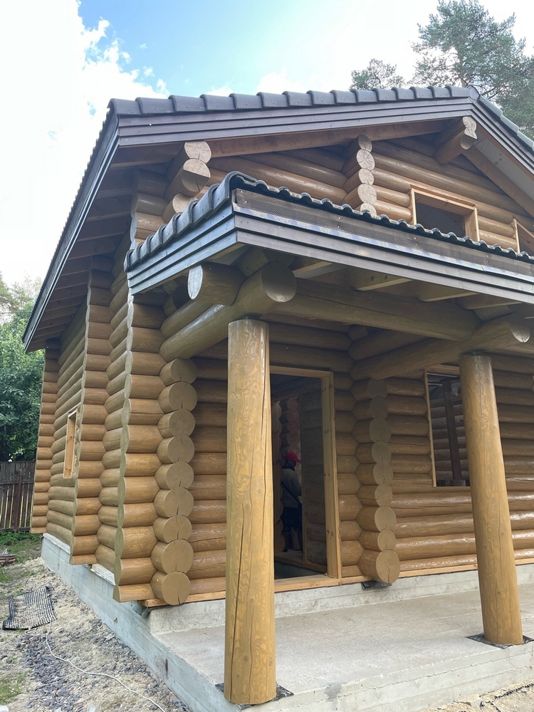 Заказчица решила построить новый дом на фамильном участке. Разумеется, выбор пал на сруб, так как более подходящего материала для здания среди вековых сосен найти сложно. Строительство выполнял другой подрядчик, а нам была поручена шлифовка и окраска дома из бревна снаружи.