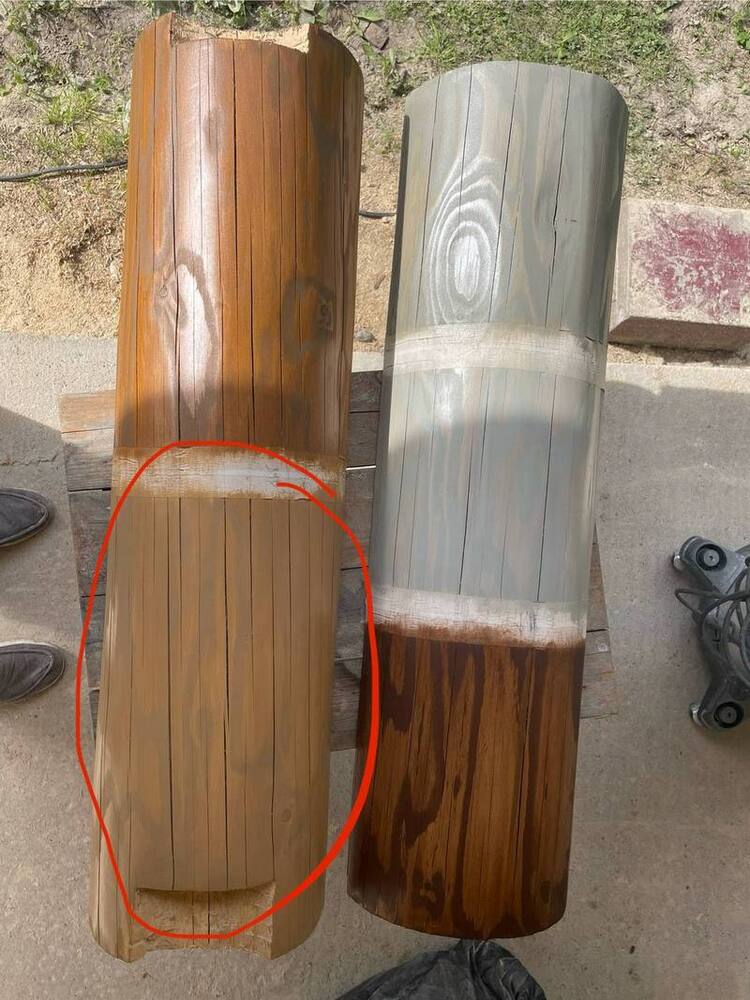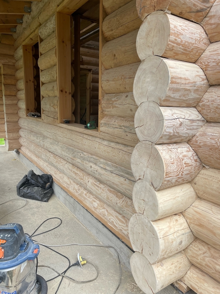 Первый этап – шлифовка стен бревенчатого сруба. Сначала мы использовали абразив с крупным зерном: это позволило устранить основные дефекты и скорректировать геометрию бревен. Затем в дело вступил мелкозернистый абразив, создавший идеально гладкую поверхность. Работы по шлифовке деревянного дома осложнялись его высотой. Чтобы добраться до верхних элементов, приходилось использовать лестницу и леса.