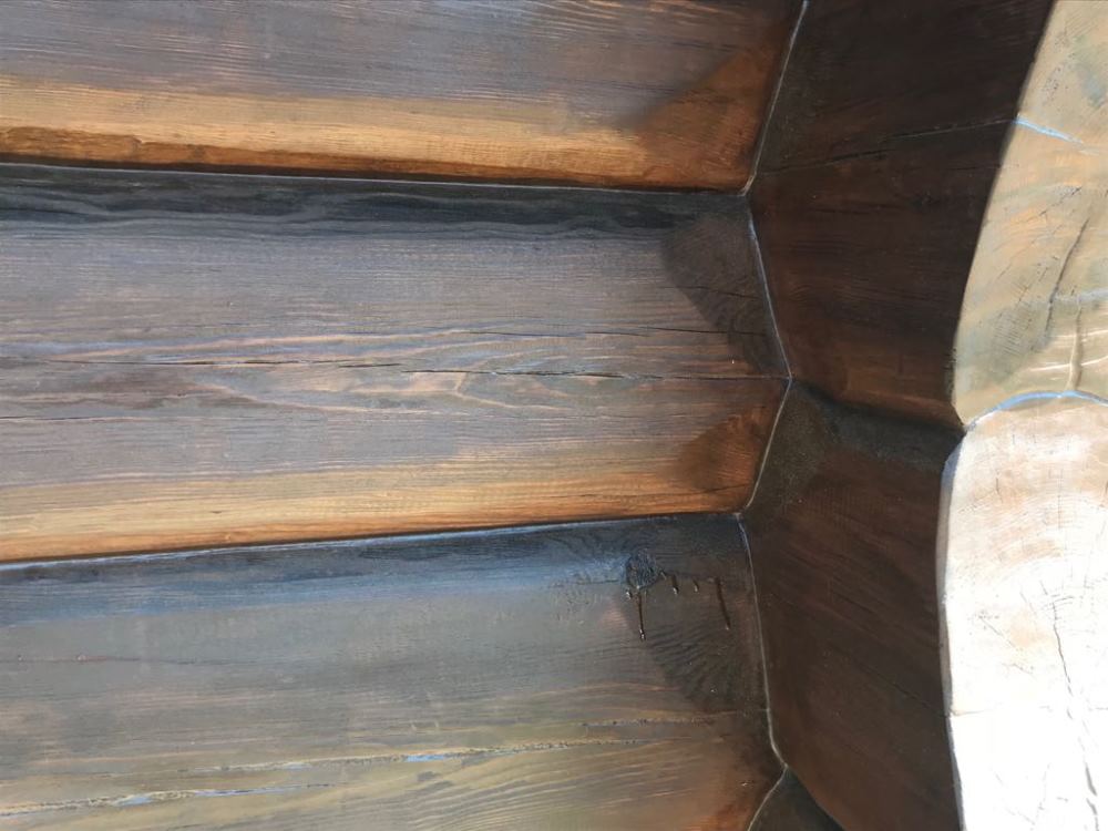 Заявка предусматривала обновление фасада сруба из лафета необычной формы, часть которого мы ранее прирубали. Дом расположен в деревне Сярьги Ленинградской области. В ходе работ по ремонту фасада мы: