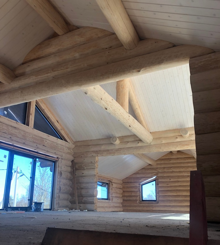 - Следующий этап – доставка сруба в разобранном виде на объект. Из бревен повторно собрали надстройку и надежно зафиксировали ее на каменном основании, после чего приступили к изготовлению и монтажу кровли, шлифовке стен сруба и герметизации зазоров между бревнами.