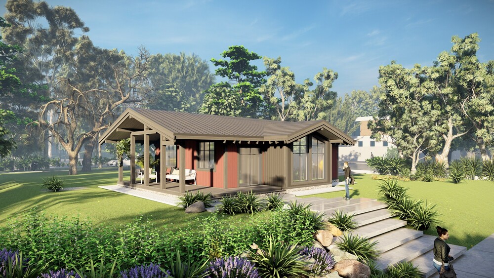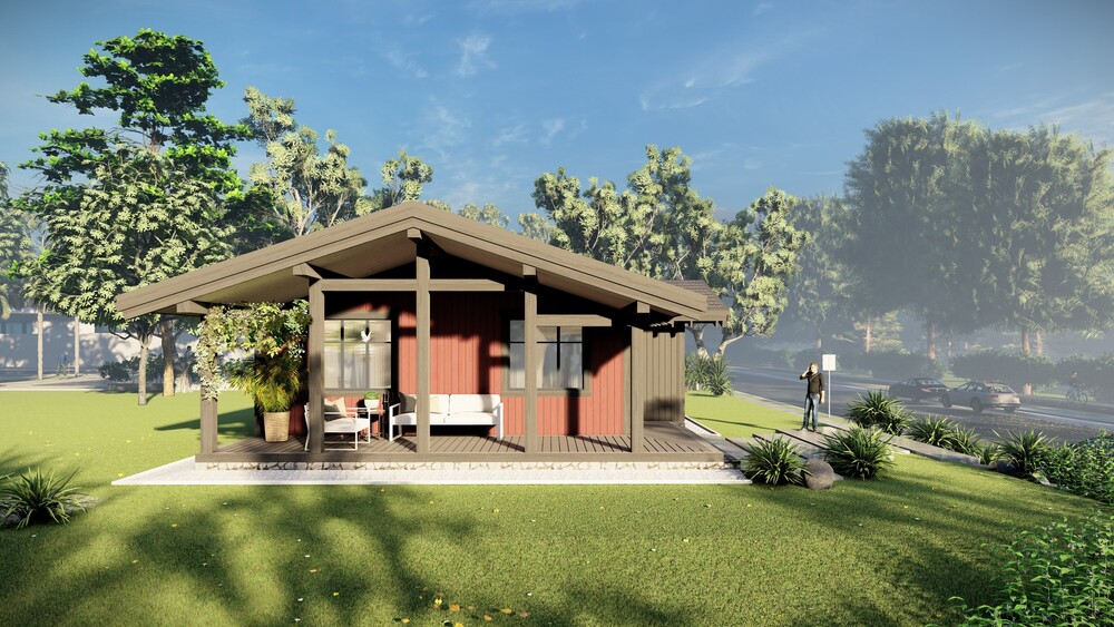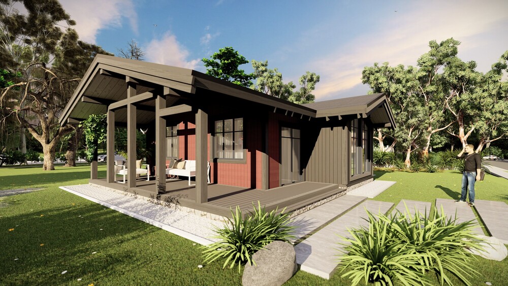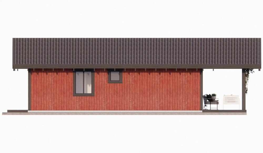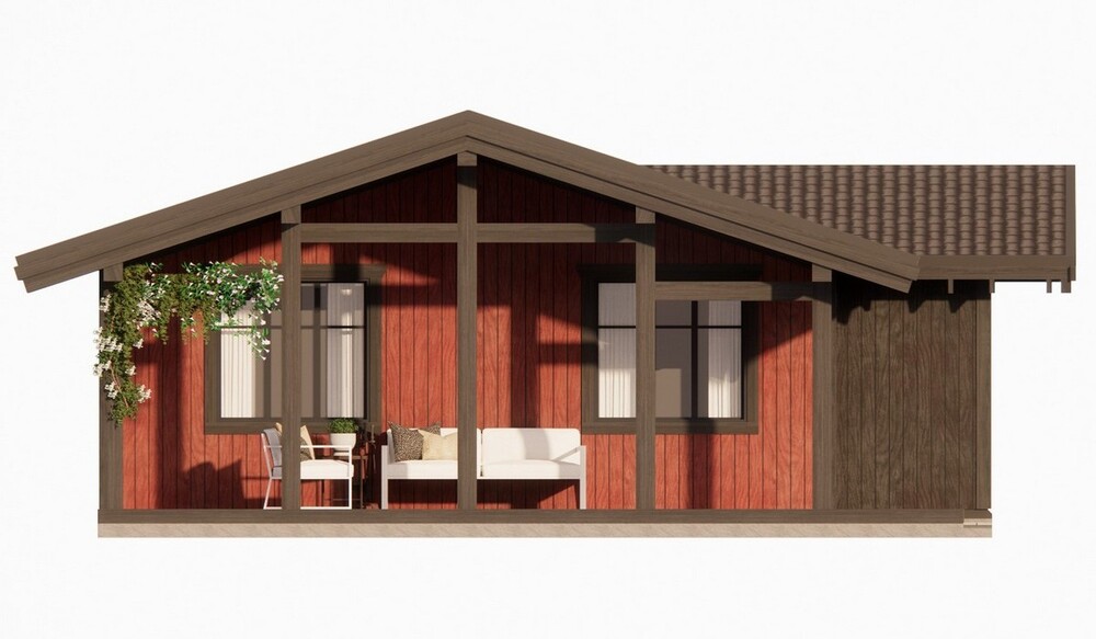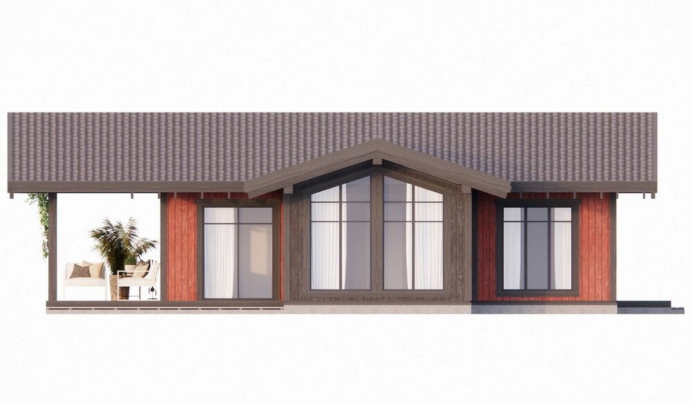 По данному проекту можно построить каркасник с тремя комнатами и живописной террасой. Здание имеет один этаж, отличается продуманной планировкой. В его центральной части расположена крупная кухня-гостиная, позволяющая принимать гостей, готовить пищу и проводить время с семьей. Для отдыха предусмотрено две спальни площадью около 10 кв.м. Этого достаточно для установки кровати и базового набора мебели.