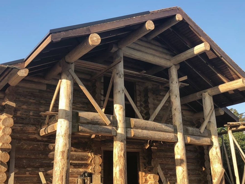 Конструкция дома Пост энд Бим часто дополняется укосинами, необходимыми с технической точки зрения или же для насыщения дизайна бревенчатыми элементами.
